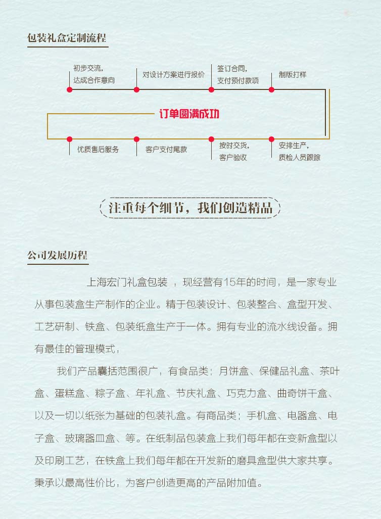 上海宏門禮盒包裝,現經營有15年的時間,是一家專業從事包裝盒生產制作的企業。精于包裝設計、包裝整合、盒型開發、工藝研制、鐵盒、包裝紙盒生產于一體。擁有專業的流水線設備。擁有最佳的管理模式, 我們產品囊括范圍很廣,有食品類:月餅盒、保健品禮盒、茶葉盒、蛋糕盒、粽子盒、年禮盒、節慶禮盒、巧克力盒、曲奇餅干盒、以及一切以紙張為基礎的包裝禮盒。有商品類:手機盒、電器盒、電子盒、玻璃器皿盒、等。在紙制品包裝盒上我們每年都在變新盒型以及印刷工藝,在鐵盒上我們每年都在開發新的磨具盒型供大家共享。秉承以最高性價比,為客戶創造更高的產品附加值。 了解詳情